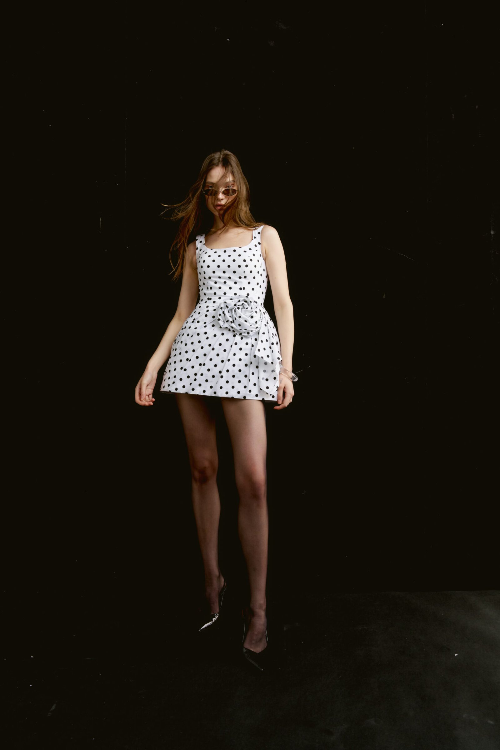 POLKA DOT MINI DRESS WITH ROSETTE DETAIL A PLAYFUL POLKA DOT MINI DRESS FEATURING A FLATTERING SQUARE NECKLINE AND A STATEMENT ROSETTE AT THE WAIST-BOLD, FEMININE, AND FULL OF CHARM.